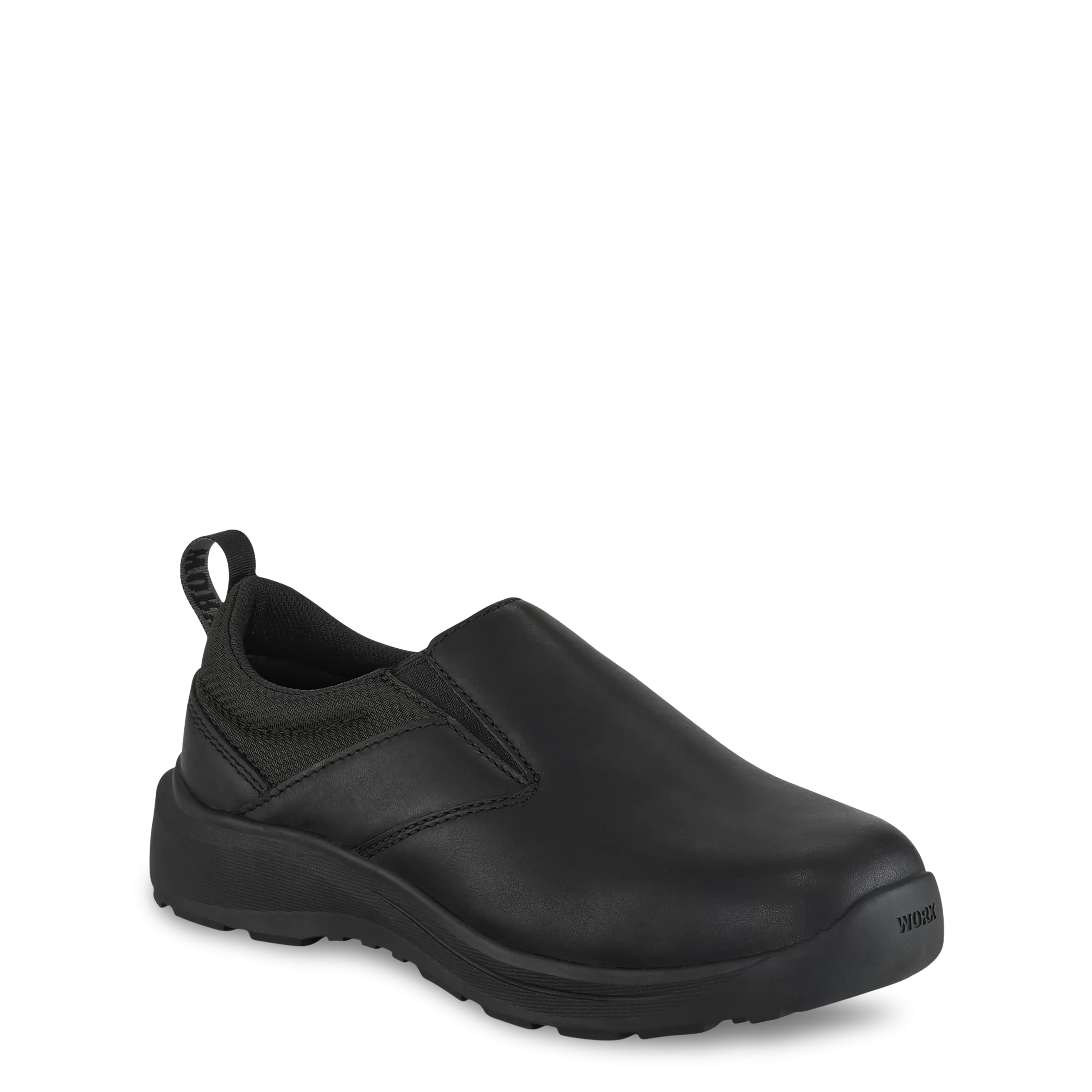Designed for a woman’s foot, this durable, comfortable and value-priced slip-on shoe provides everything needed to stay productive and protected in a variety of light-duty work environments. Its cement construction and TPU midsole provide lightweight flexibility and comfort on the go, while the black leather upper stands up to scratches and abrasion. A steel safety toe and electrical hazard protection provide yet another layer of defense, and the removable EVA footbed offers extra cushion for walking on hard surfaces. Underneath, the EssentialsLite outsole delivers best-in-class slip resistance. This is the ideal safety footwear for environments ranging from service, transportation and manufacturing to warehousing and municipality work.